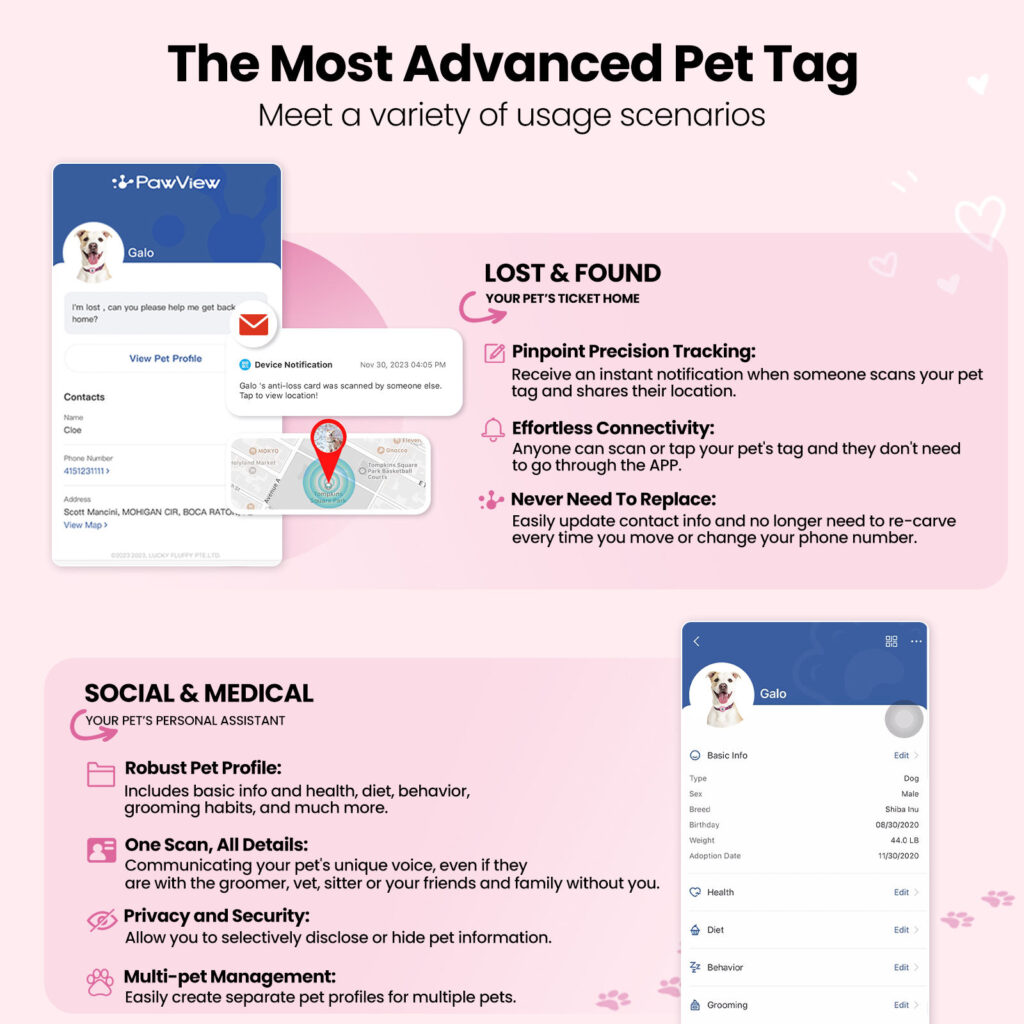 - Fast Lost-and-Found: tap/scan opens mobile profile with contact, meds, microchip #, vet notes.